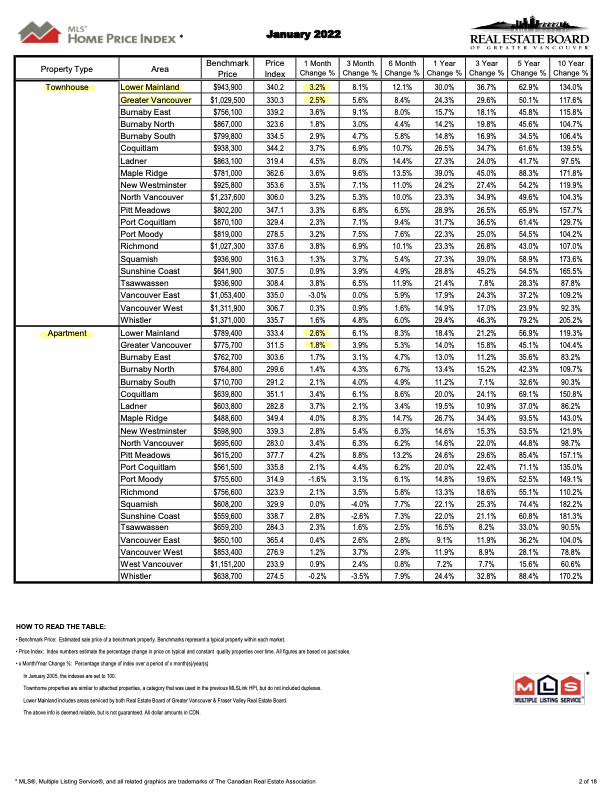 The MLS® Home Price Index composite benchmark price for all residential properties in Metro Vancouver is currently $1,255,200. This represents a 18.5 per cent increase over January 2021 and a two per cent increase compared to December 2021.
